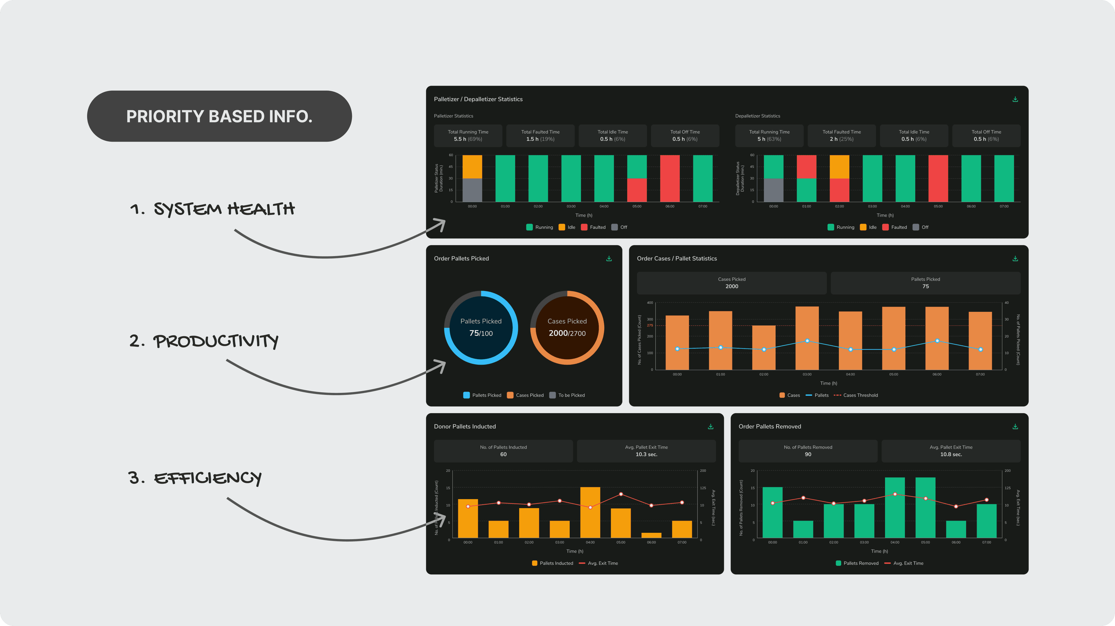 Priority-Based Information Structure: Operational data is organized by decision urgency—system health first, productivity next, efficiency last.